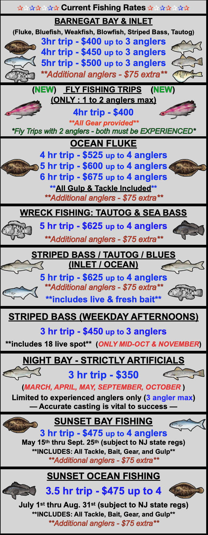 If interested in a charter or sunset - fill out the form below. You can also call or text my cell: 609-290-7709 All major CC’s accepted at the dock.